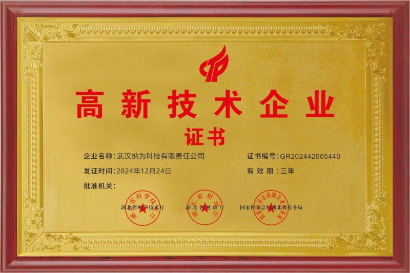 2024年12月,在即將辭舊迎新的年末,武漢納為科技有限責任公司正式收到高新技術企業證書,這一里程碑式的成就標志著公司在技術創新和市場拓展方面邁出了堅實的一步,也為公司在儀器儀表行業的持續發展注入了強大動力。
